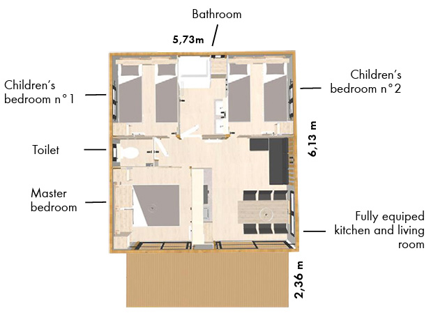 | voor max. 6 personen | 33 m2 (5,5x6 m) | overdekt terras 14 m2 |